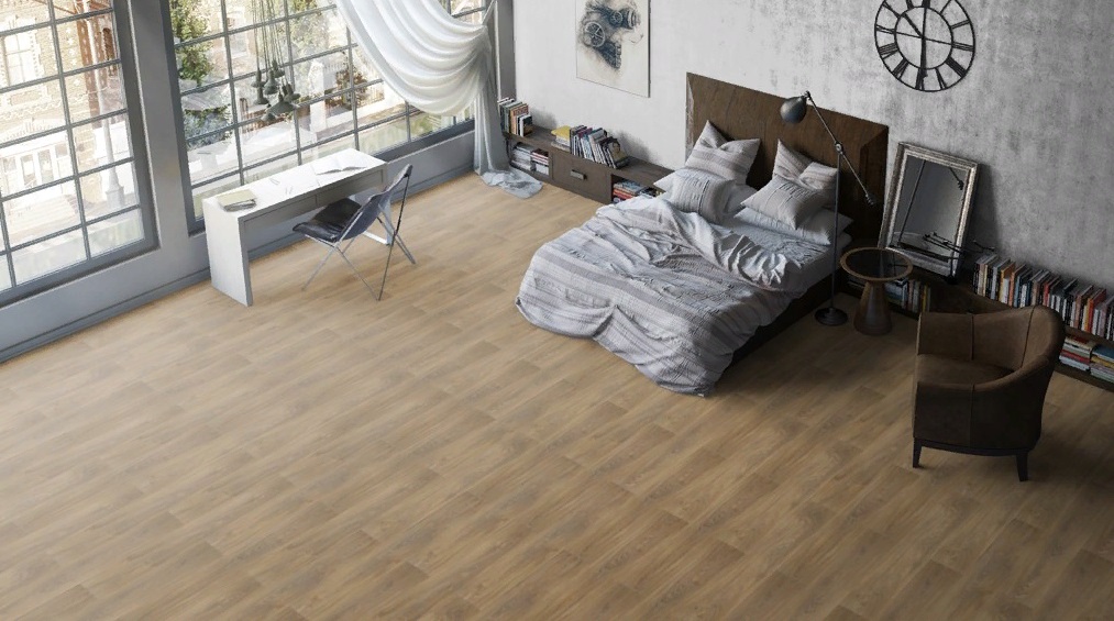 Четырехсторонняя фаска подчеркивает формат каждой планки, а однополосный рисунок, выполненный в теплых коричневых тонах, создает эффект цельной массивной доски, гармонизируя пространство. Повышенная влагостойкость позволяет укладывать ламинат на кухне и в коридоре — он не боится случайных капель и влажной уборки.